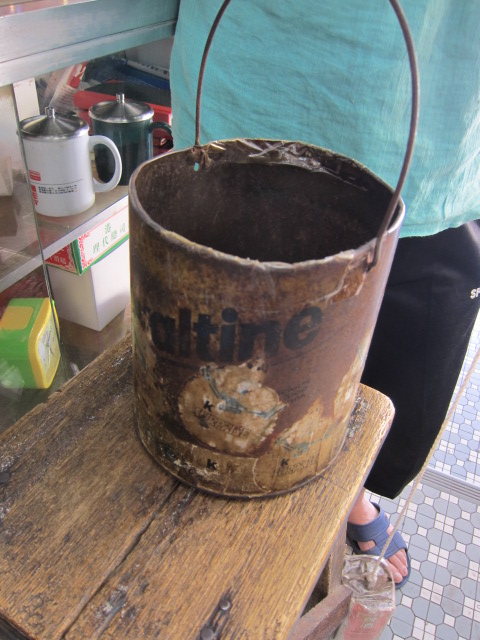 「這原本是掛在上面(樑上)的;不過最近兒子幫手裝修天花,所以先拆下來方便他工作,待他完成後就掛回去。」這「奶罐」,是一個大鐵罐綁上繩子,另一端就接上一個重物,中間掛勾位置安上滑輪。掛在牆上時,鐵罐會升上,待要收錢時把鐵罐拉下做找贖等,完成後放手,鐵罐又會升回原位;以前辦館都採用這方法放錢,將錢銀置於高處使小偷難以下手,是一個簡單的「收銀機」也。
