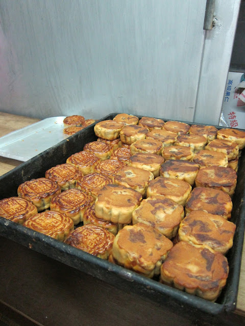 月餅都是新鮮制作;事頭婆緊張地說,沒有雙黃豆沙,要下午才出爐 -是的,後面廚房,三個人,人人都忙個不停,密鑼緊鼓地量豆沙,搓麵團....真的,月餅都是新鮮出爐 (怪不得甫走近店面就飄來月餅香),也是一個個人手制作。